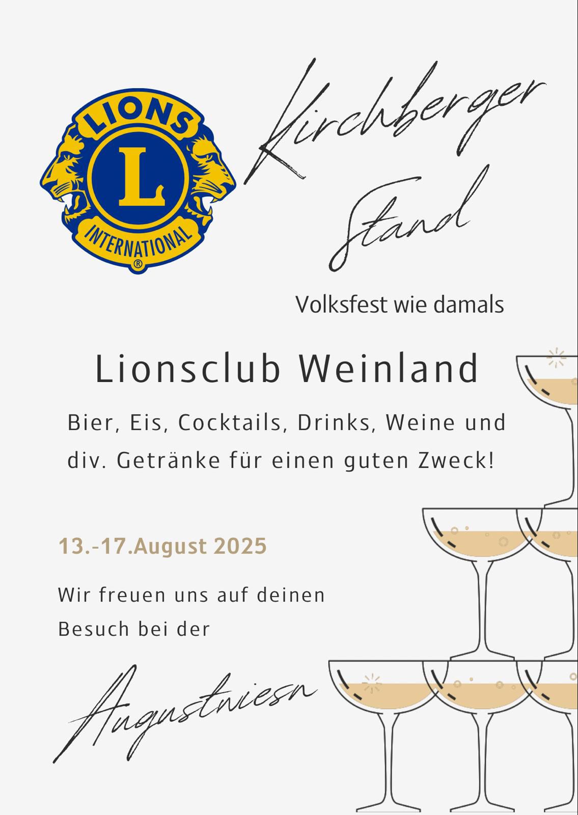 Vom 13.-17. August fand am Hollabrunner Messegelände die 11. Augustwiesn statt, wo natürlich auch der Lions-Club Weinland traditionell mit seinem Kirchberger-Getränkestand vertreten war.